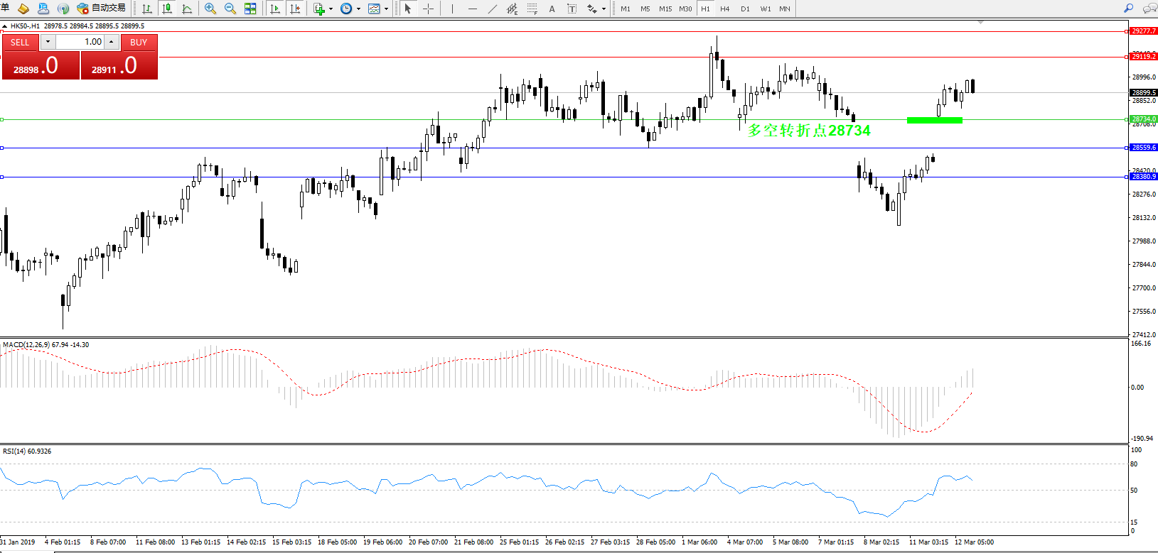 恒指HK50 ——1小时K线图显示: