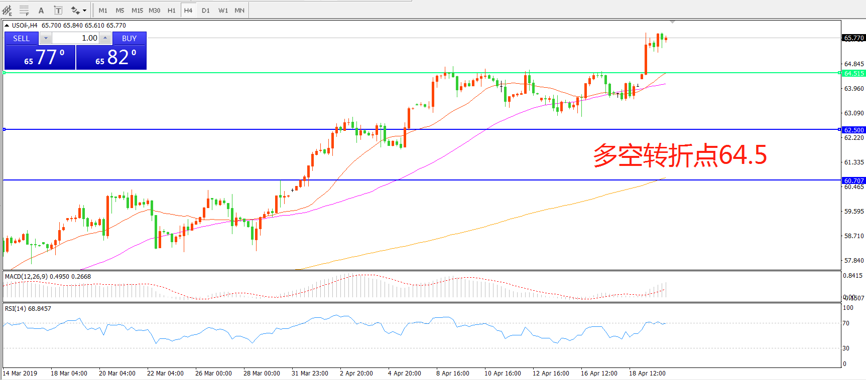4月22日周一,美国白宫正式发布声明称,美国总统特朗普决定不会更新5月2日到期的进口伊朗原油豁免政策,目的是将伊朗原油出口降至零。虽然沙特表示,将会在美国终结伊朗原油进口豁免后确保油市的稳定,但这不足以令市场相信该国将会大幅推高产量。受此消息影响,国际油价周一跳升约3%,美国WTI原油价格最高触及65.98美元/桶,最终收报65.65美元/桶,创最近六个月收盘新高。