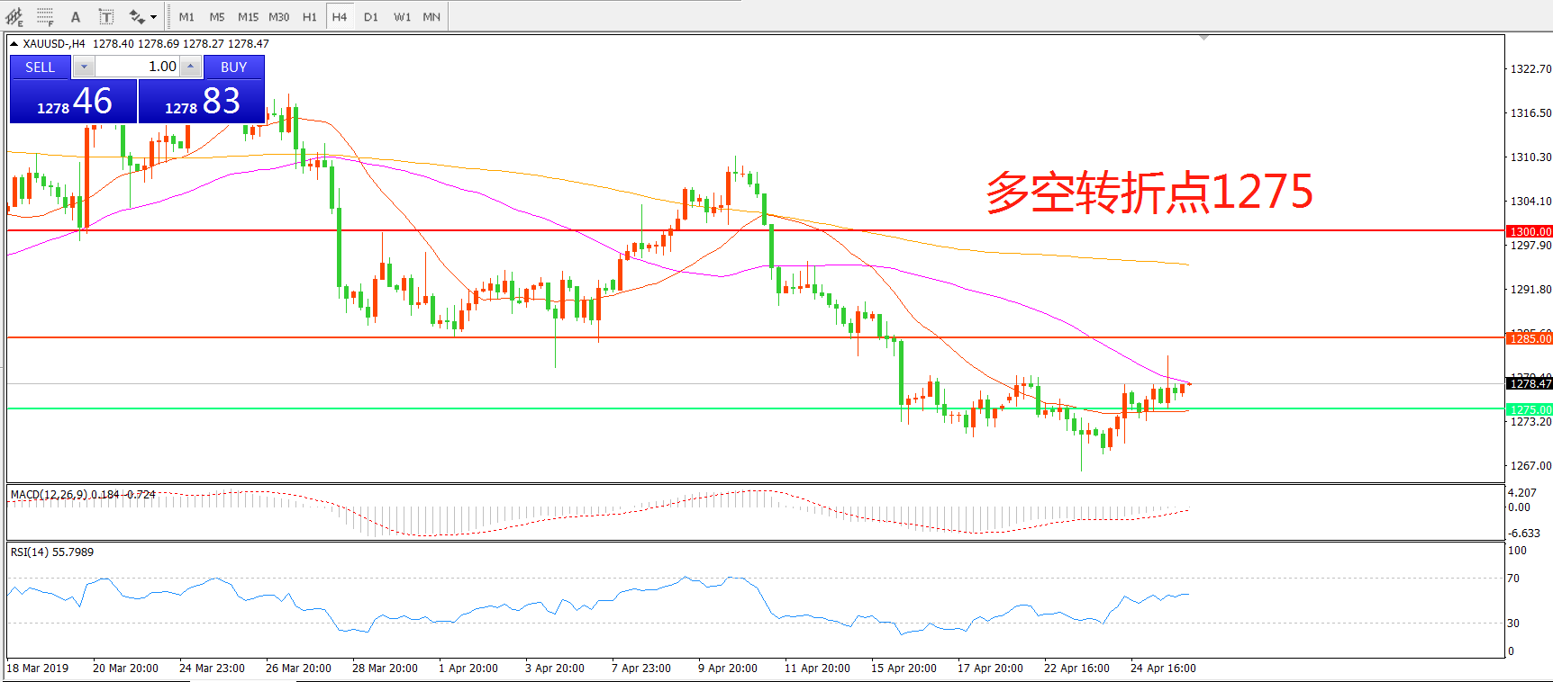 周四(4月25日) 在美国耐用品订单和初请失业金人数数据公布之后,美元指数短线波动加剧,随着美元涨势略缓以及市场避险情绪的回温,现货黄金回升至1280美元/盎司关口上方。眼下市场焦点转向周五出炉的美国一季度GDP数据,届时势必会引发市场波动。