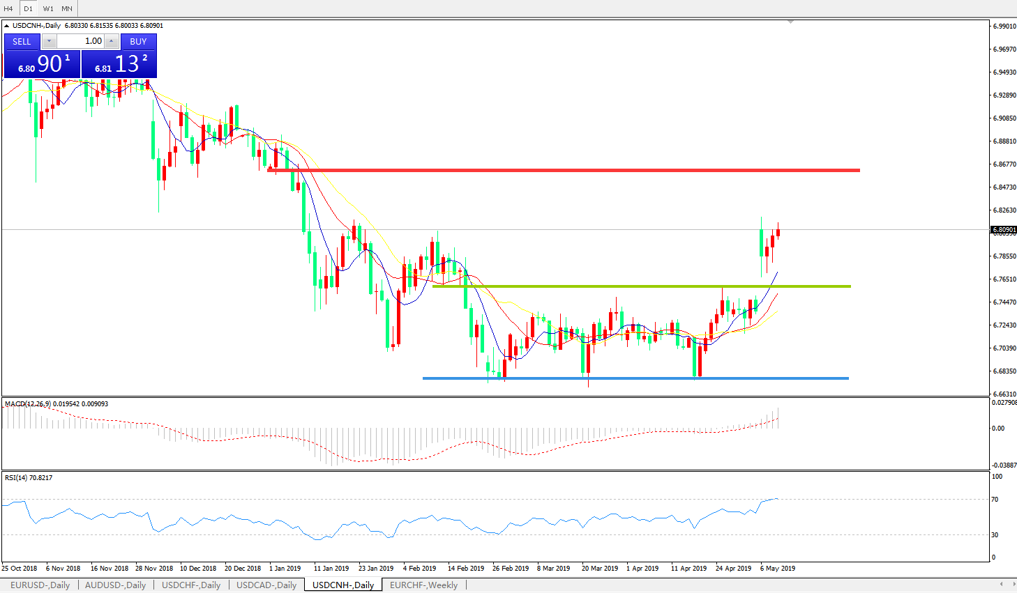 交易策略: 在6.7560之上,看涨,目标价位为6.8585,然后为6.9200。