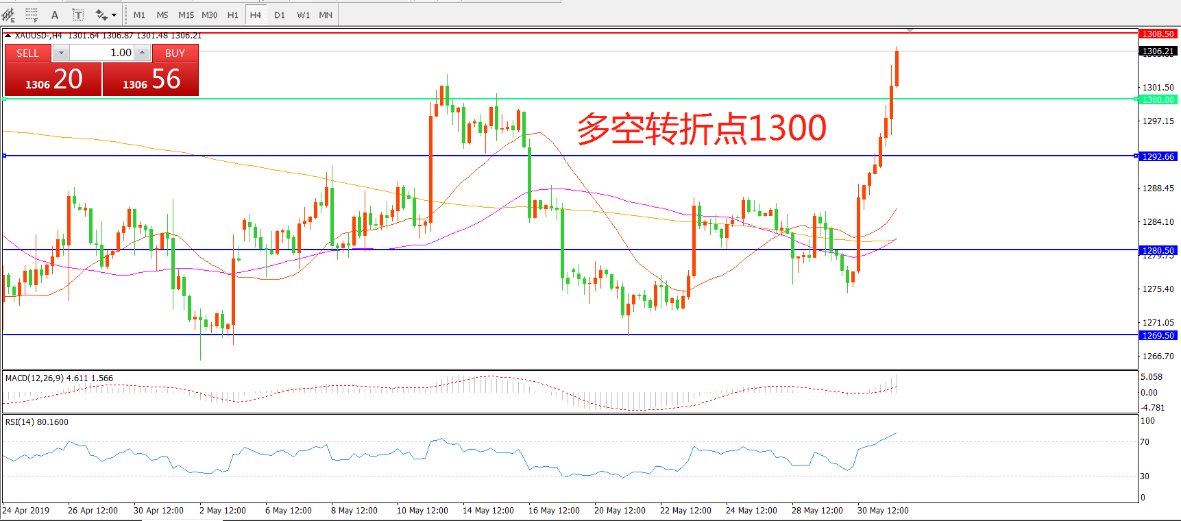 多空转折点:1300.00