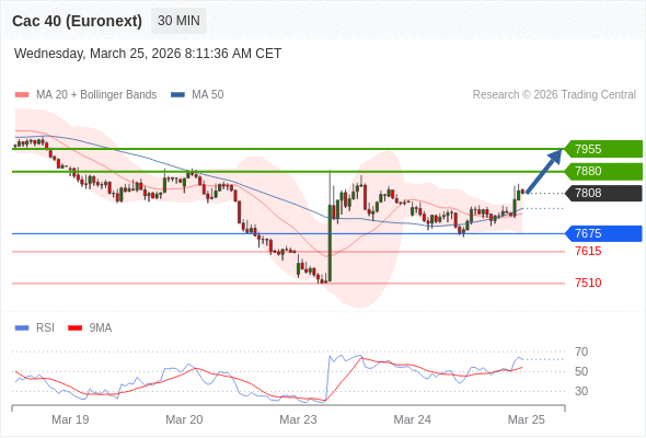 法国CAC指数期货 (Euronext) (J6) 当日内: 期待7880。