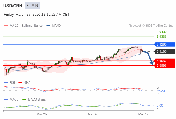 交易策略: 逐渐下跌,当 6.9260 阻碍上行,则 6.8968 为目标位。