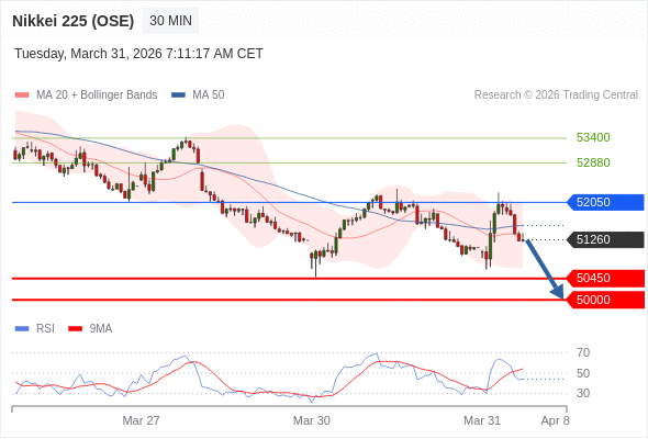 交易策略: 在 52050 之下,看跌,目标价位为 50450 ,然后为 50000 。