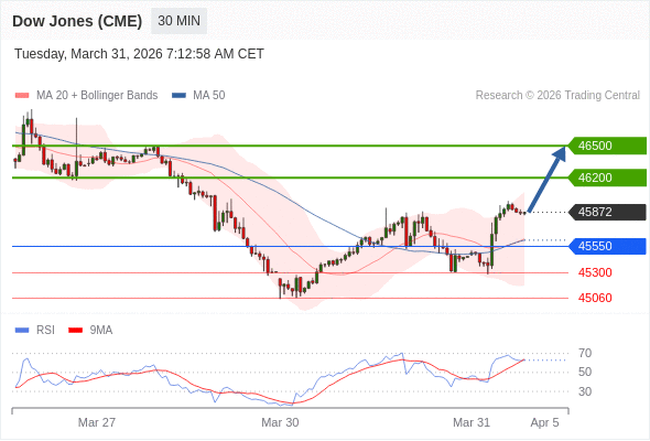 在 45550 之上,看涨,目标价位为 46200 ,然后为 46500 。