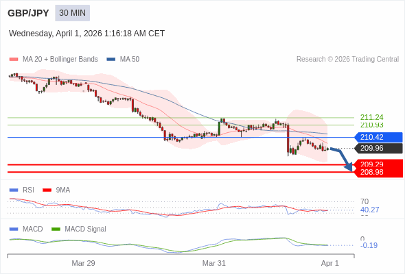 英镑/日元 当日内 : 看跌,在 210.42 之下。