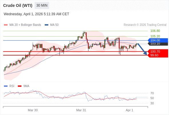 交易策略: 在 104.00 之下,看跌,目标价位为 100.70 ,然后为 99.60 。