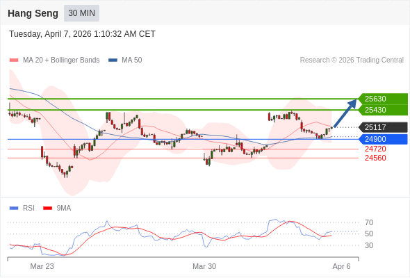 恒生指数 当日内: 在24900之上,看涨。