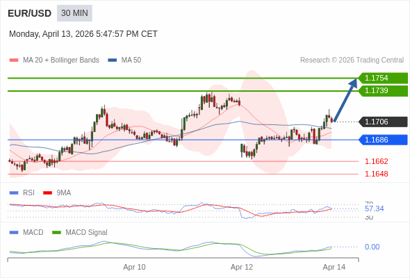 欧元/美元 当日内 : 看涨,当 1.1686 为支撑位。