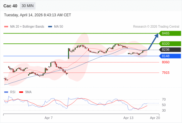Cac 40 当日内: 超短线(当日内)支撑位在8148附近。