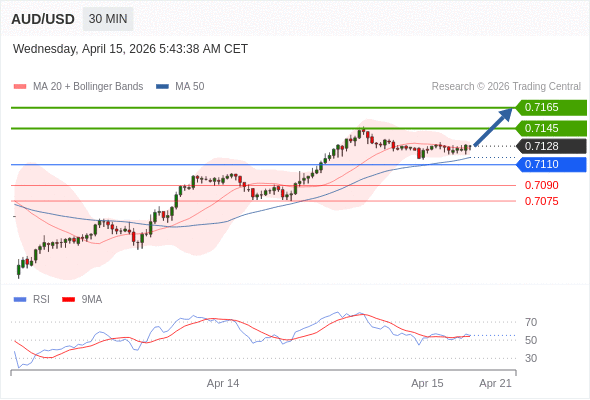 在 0.7110 之上,看涨,目标价位为 0.7145 ,然后为 0.7165 。