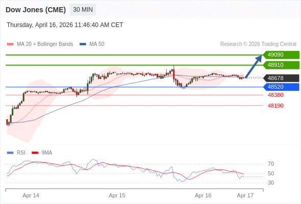 在 48520 之上,看涨,目标价位为 48910 ,然后为 49090 。