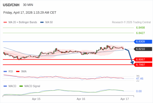 美元/人民币 当日内 : 逐渐下跌,当 6.8309 阻碍上行,则 6.7997 为目标位。