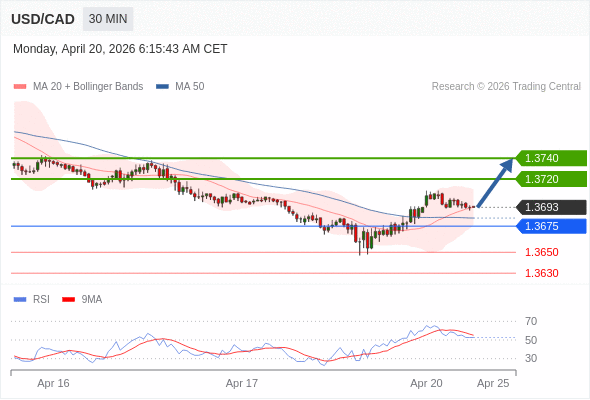在 1.3675 之上,看涨,目标价位为 1.3720 ,然后为 1.3740 。