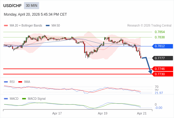 技术点评: RSI技术指标小于30。在这种情况下,说明有很强的下跌趋势,或者意味着处在超卖的状态下,可能会有向上的反弹。我们将观察RSI技术指标是否出现背离现象。 MACD技术指标处在其信号线之下看空。 配置为负。 此外,价位低于其20天及50天移动平均线 ( 分别位于0.7811 和0.7814 )。 最后,价位跌破其布林线通道下轨 (位于0.7783。