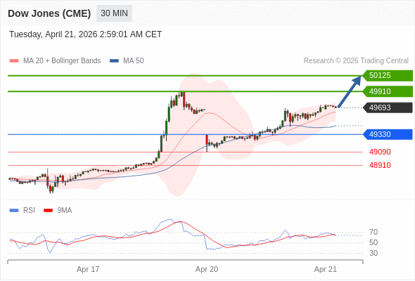 在 49330 之上,看涨,目标价位为 49910 ,然后为 50125 。