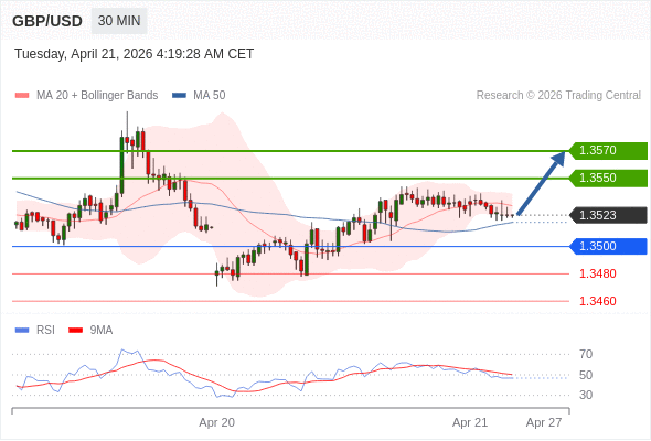在 1.3500 之上,看涨,目标价位为 1.3550 ,然后为 1.3570 。