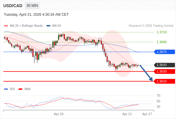 在 1.3670 之下,看跌,目标价位为 1.3630 ,然后为 1.3610 。