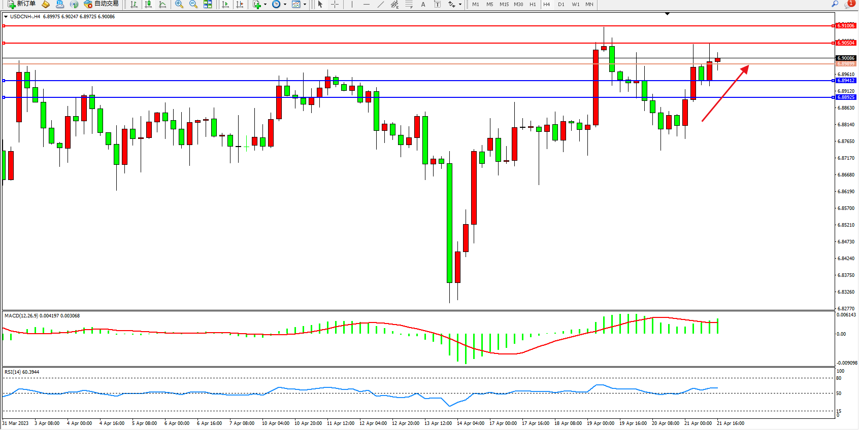 交易策略:6.89899上方看涨,目标6.90504 6.91006