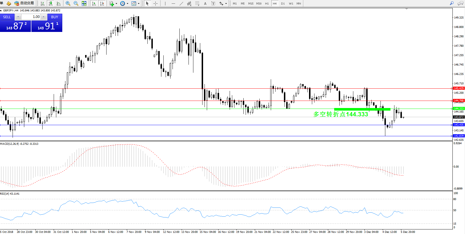 交易策略:144.333下方看跌,目标143.435、142.839