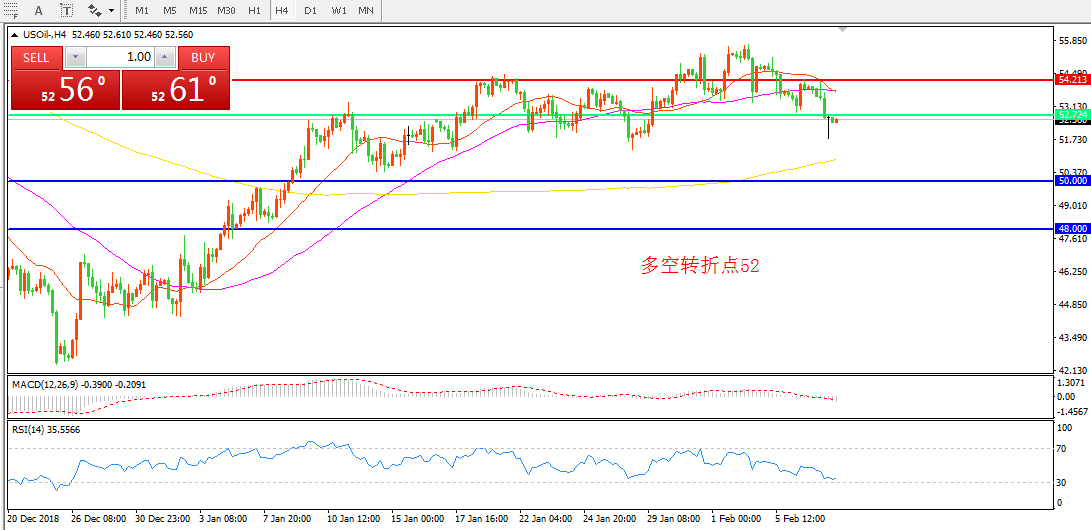 4小时图看,油价跌破52.7一线支撑无力收复,21均线下穿55均线形成死叉, MACD红柱缩减,绿柱增加,RSI拐头向下,日内有下探50美金支撑可能。