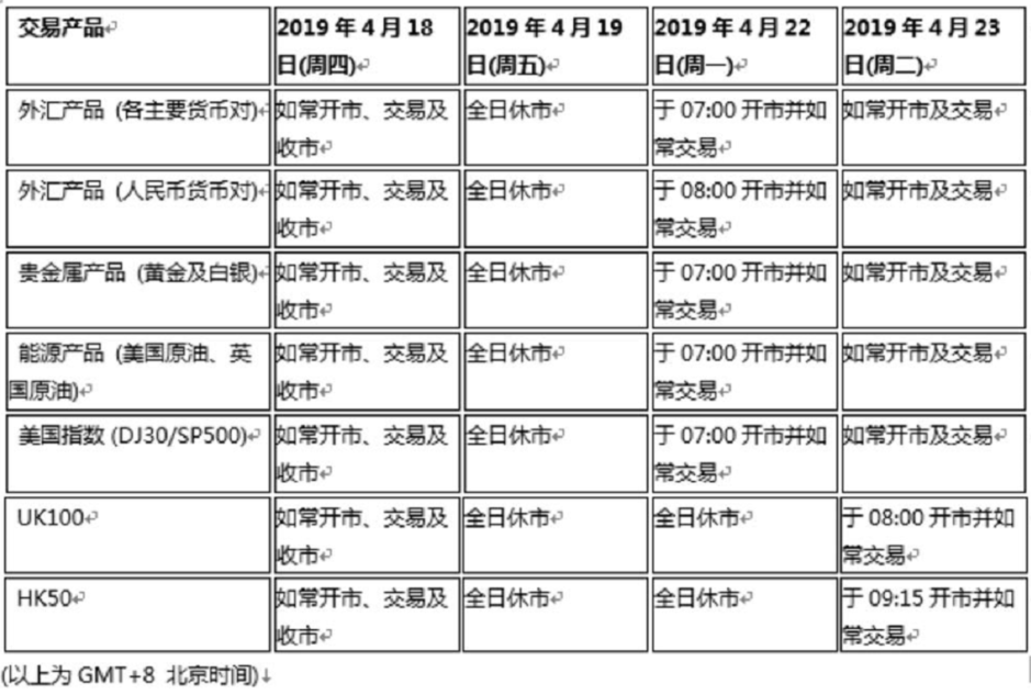 由于2019年4月19日(周五)为欧美市场耶稣受难假期2019年4月22(周)为亚欧市场复活节假期以下市场交易产品的交易时间将于假期期间休市,敬请留意知悉!