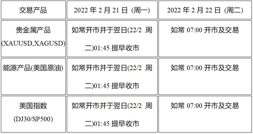 因应美国总统日假期 (2022年2月21日 周一),本公司以下产品的交易时间将于假期期间作以下安排,敬请留意。