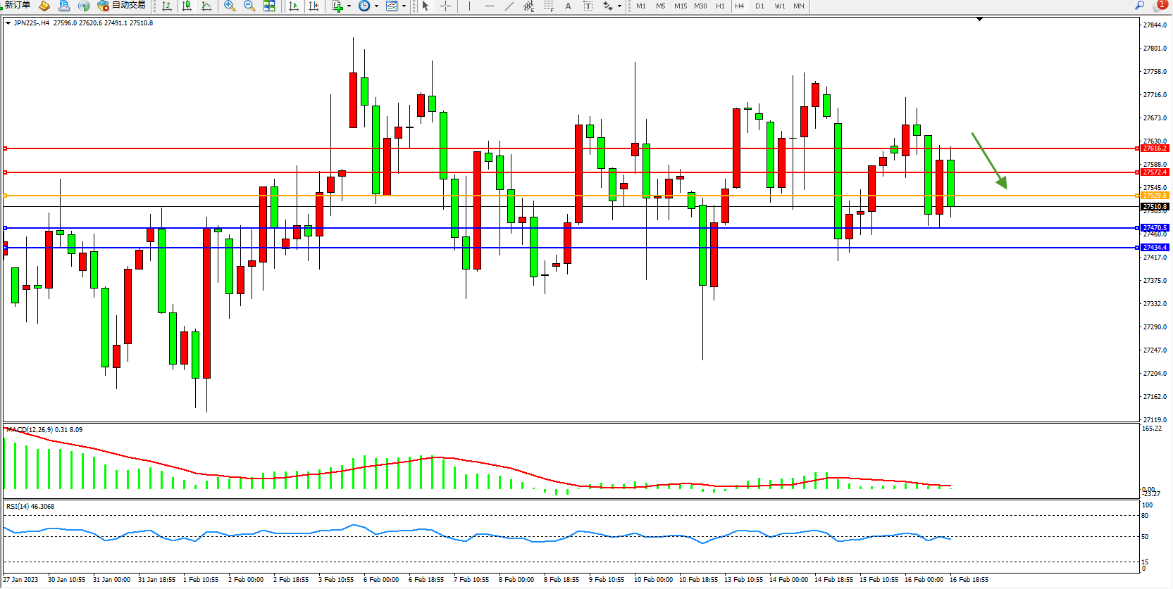 日经指数JPN225——4小时K线图显示: